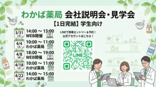 新卒採用 【就活生必見】わかば薬局 会社説明会・店舗見学会のお知らせ🌿 薬学生・就活生の皆さん、こんにちは!東京調剤センターの採用担当です。就職活動が本格化してきましたが、皆さんいかがお過ごしでしょうか?「実際の職場の雰囲気を見てみたい」「どんな薬剤師さんが働いているのか知りたい」という方に向けて、わかば薬局と... 2026.03.30 新卒採用